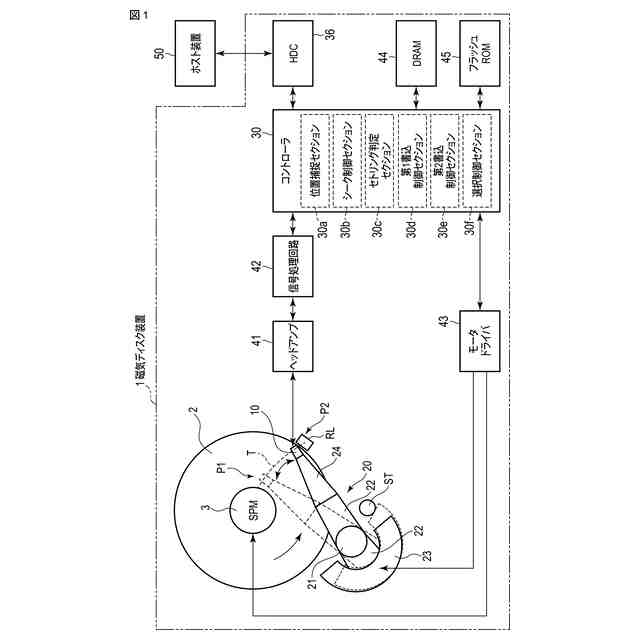 図1に示すように、磁気ディスク装置1は、記録媒体である磁気ディスク2、この磁気ディスク2を回転駆動するスピンドルモータ3、その磁気ディスク2に対するデータの書込み(ライト)および読出し(リード)を行う磁気ヘッド10を含む。この磁気ヘッド10を支持するアクチュエータ20が磁気ディスク2の近傍に配置されている。