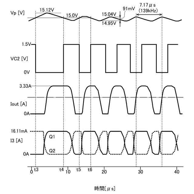 図4は、実施形態に係るモータドライバ回路における、VPWR端子の電圧、第2コンパレータの出力信号、第1トランジスタと第2トランジスタに流れる第3電流、クランプ用トランジスタに流れるクランプ電流を示すタイムチャートである。