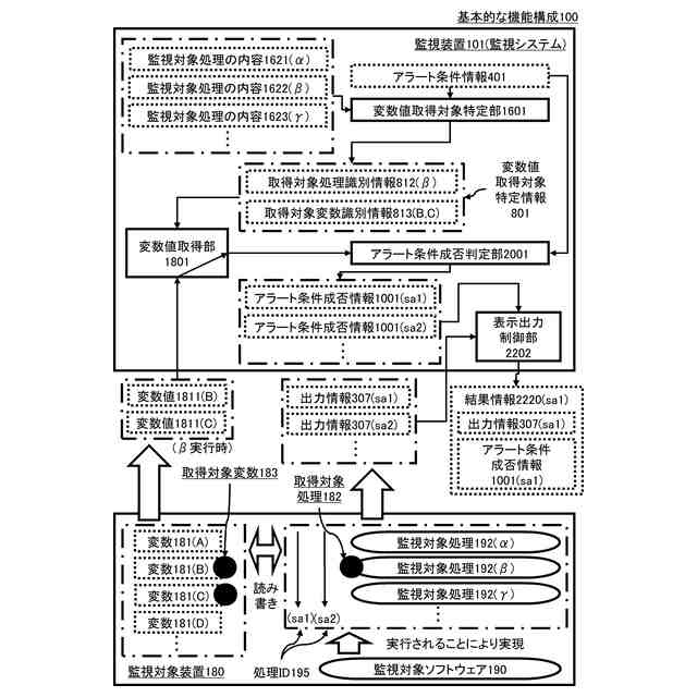 【解決手段】 変数値取得対象特定部1601は、監視対象装置180のアラート条件と、監視対象処理192の内容に基づいて、取得対象処理182と取得対象変数183を特定する。変数値取得部1801は、取得対象処理182が行われる際に、取得対象変数183の変数値1811を取得する。アラート条件成否判定部2001は、変数値取得部1801が取得した変数値1811に基づいて、アラート条件が成立するか否かを判定する。表示出力制御部2202は、監視対象処理192に基づいて出力される出力情報307と、アラート条件の成立の有無を示す情報を関連付けて、表示または出力するように制御を行う。
