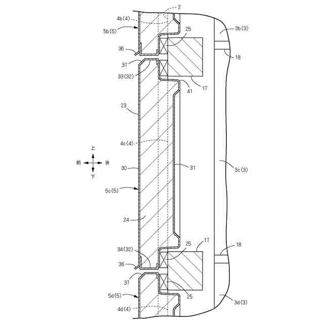 本発明の断熱扉は、その前面に付着し流下した水が断熱扉の下面に回り込むのを阻止する水切りのための構造を備えるが、このような構造を備える扉は、例えば特許文献2に公知である。特許文献2に記載の扉は、屋外に設置される配電盤の扉であり、前後に扁平な扉の前面の下端に、前面を伝って扉の下部空間へ水が流れ込むのを阻止する水切板が設けられている。該水切り板は、断面略クランク状に形成されており、その上側の垂直片が扉の前面に固定されて、扉に一体的に設けられている。扉の前面に付着し流下した水は、水切り板で前方に案内され水切り板の下端から滴下される。