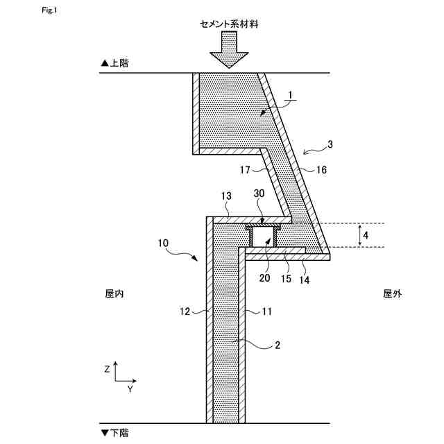 ところで、例えば外壁上部から屋外側に向かって張り出した軒部分の軒天(軒裏ともいう)のように、セメント系材料に対して上下方向に貫通する貫通口を形成することが必要となる場合がある。この場合、従来は、例えば軒天の下方部分に対応する型枠を組んで、その上にスリーブを設置し、そのスリーブの上には型枠を作らない状態で、スリーブの上端がセメント系材料の面から突出するように、その型枠内に生のセメント系材料を型枠内に流し込むことが行われていた。しかしながら、例えば資材調達が困難でスリーブのサイズを変更できないといったような事情から、スリーブの長さをその埋込部分のセメント系材料の厚さよりも長くできない場合には、上記の方法では施工することができないという課題があった。つまり、スリーブの長さがその埋込部分のセメント系材料の厚さよりも短い場合、スリーブの上端がセメント系材料の面から突出しないため、仮にこの状態で型枠内に生のセメント系材料を流し込むこととすると、スリーブの内部にセメント系材料が流れ込み貫通口が形成されなくなってしまう。