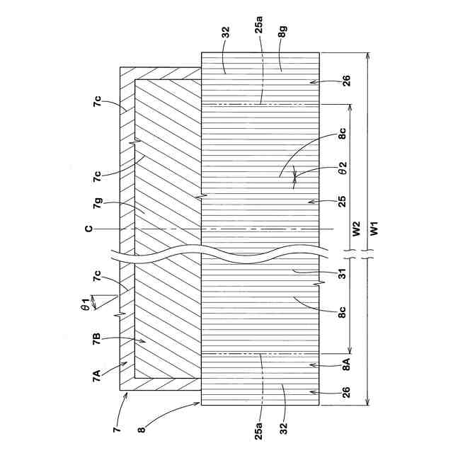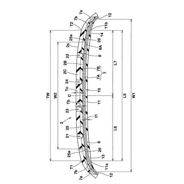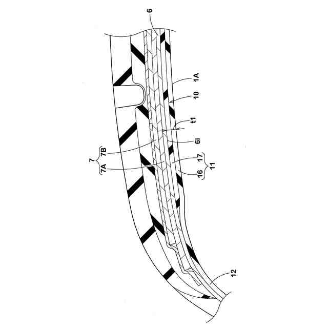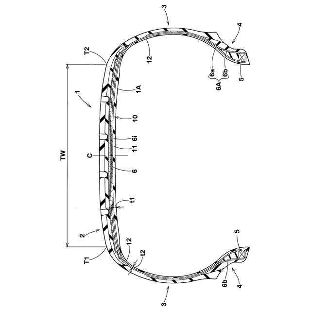 前記内側ゴムは、前記トレッド部を第1厚さで延びる第1部分と、前記一対のサイドウォール部を第2厚さで延びる第2部分とを含み、