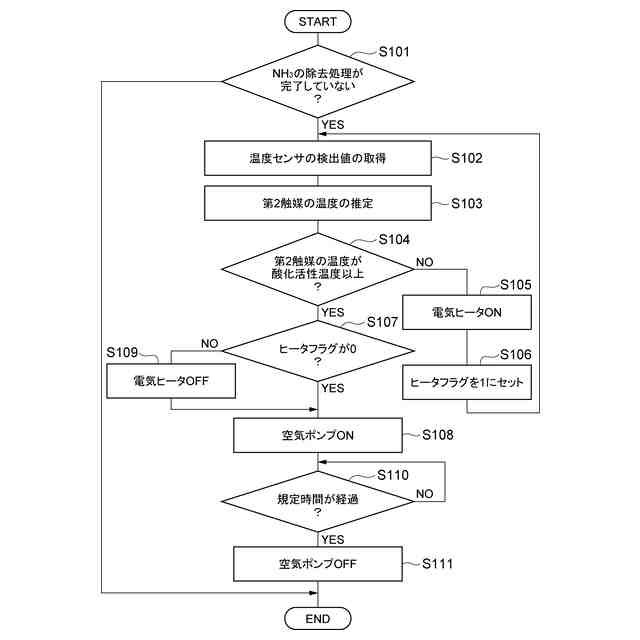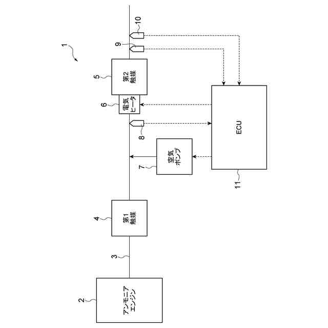 を酸化する機能とを有する第2触媒5と、第2触媒5に空気を供給する空気ポンプ7と、アンモニアエンジン2が停止した状態で、第2触媒5に吸着されたNH