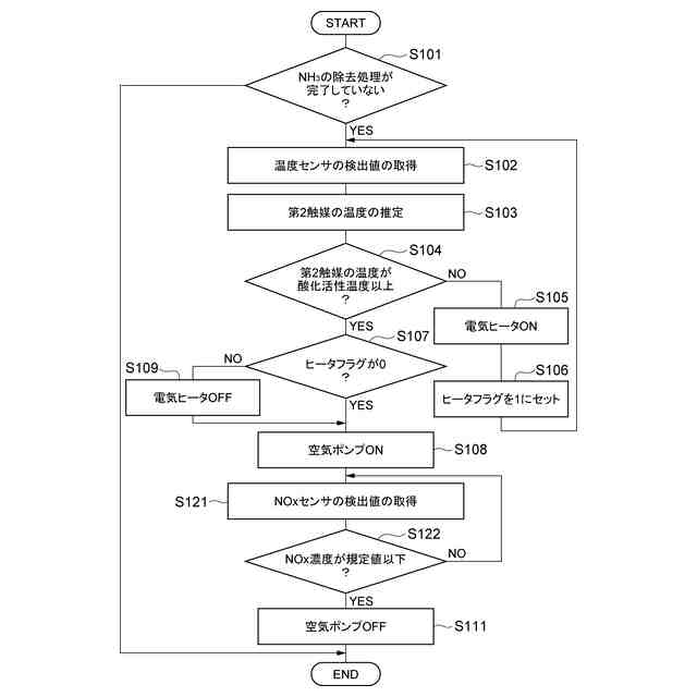 (2)上記の(1)において、排気浄化装置は、第2触媒を加熱する加熱部と、第2触媒の温度を検出する温度検出部と、温度検出部により検出された第2触媒の温度がアンモニアの酸化が可能となる酸化活性温度以上であるかどうかを判定する温度判定部と、温度判定部により第2触媒の温度が酸化活性温度以上でないと判定されたときは、第2触媒の加熱を行うように加熱部を制御する加熱制御部とを更に備え、加熱制御部は、加熱部により第2触媒の加熱が開始された後、第2触媒の温度が酸化活性温度以上であると判定されたときは、第2触媒の加熱を停止するように加熱部を制御し、空気供給制御部は、第2触媒に吸着されたアンモニアの量が規定量以下でないと判断されると共に、第2触媒の温度が酸化活性温度以上であると判定されたときに、第2触媒への空気の供給を行うように空気供給部を制御してもよい。