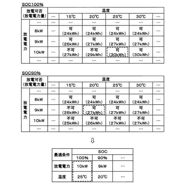 各条件における前記充電又は放電の可否及び前記電力量の比較に基づいて、充電又は放電が可能であり、電力量を最大化する及び温度を最小化する条件の前記電力量又は電力及び温度を推定する