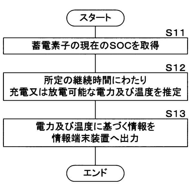 取得した前記内部状態量と、前記蓄電素子に要求する充電又は放電の継続時間とに基づいて、前記蓄電素子が前記継続時間にわたり充電又は放電可能な電力量又は電力及び温度を推定し、