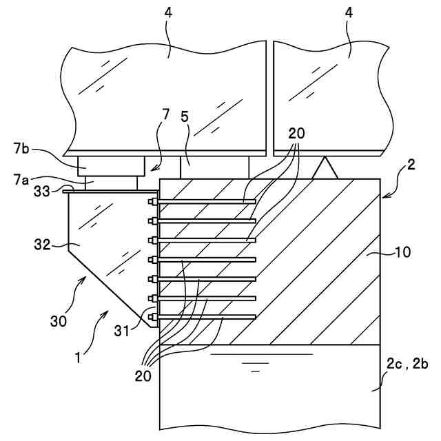 橋脚の側端面からアンカーボルトまでの距離が小さい場合には、アンカーボルトの引き抜き耐力を十分に確保できない場合がある。この場合には、橋脚の側端面にコンクリートを増設して、橋脚の橋幅方向の断面を大きくすることで、アンカーボルトの引き抜き耐力を確保している。この構成では、橋脚の重量が増加するため、橋脚の基部の補強が必要になる場合がある。