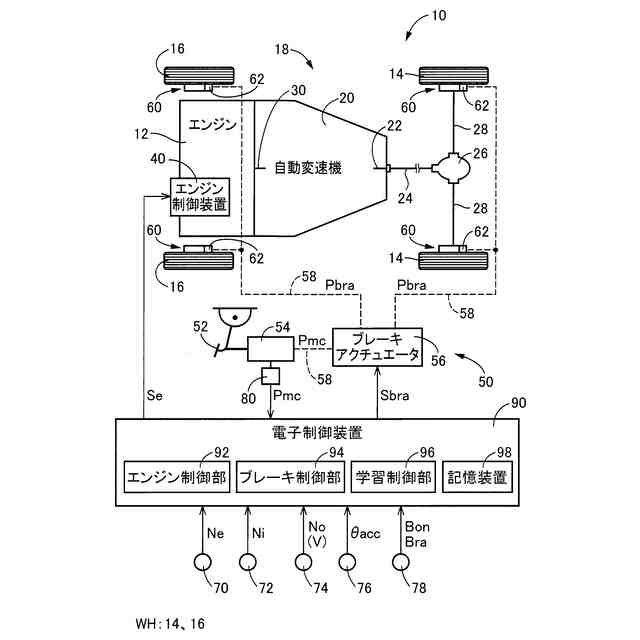 図1は、本発明が適用される車両10の概略構成を説明する図であると共に、車両10における各種制御の為の制御機能及び制御系統の要部を説明する図である。図1において、車両10は、動力源としてのエンジン12と、駆動輪14及び従動輪16を含む車輪WHと、エンジン12と駆動輪14との間の動力伝達経路に設けられた動力伝達装置18と、を備えている。尚、動力源は、エンジン12に加えて電動機が用いられても良い。又、車両10が全輪駆動車両であれば、従動輪16は駆動輪となる。