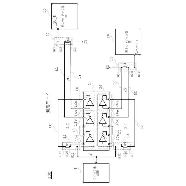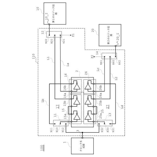 図1は、実施の形態1に係る電子回路110を備えた電子装置100の構成を示す図である。電子装置100は、クロック生成器1と、電子回路110と、第1のロジック回路10及び第2のロジック回路20とを備える。電子回路110は、ICパッケージ2、第1の配線L1、第2の配線L2、配線La、配線Lb、配線Lc、配線Ld、及び、第1~第4の接続切り替え用端子部11~14を備えている。クロック生成器1、電子回路110、第1のロジック回路10及び第2のロジック回路20はすべて同一の基板上に実装されている。電子回路110は、クロック生成器1から第1のロジック回路10及び第2のロジック回路20までのクロック信号の伝送経路の遅延時間差の測定モードと、クロック生成器1で生成されるクロック信号を第1のロジック回路10及び第2のロジック回路20に伝送(提供)する通常モードとを備える。通常モードでは、測定モードに基づいて算出された遅延時間差を考慮して第1のロジック回路10及び第2のロジック回路20の動作タイミング設定がなされている。以下、図1の電子装置100について詳細に説明する。