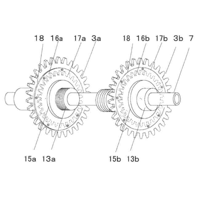 請求項2に記載の波力発電装置は、一方向クラッチAとピニオンAは同心に配列接続し、一方向クラッチBとピニオンBも同心に配列接続し、共に増速機構の第1段の軸に挿入設置したものである。