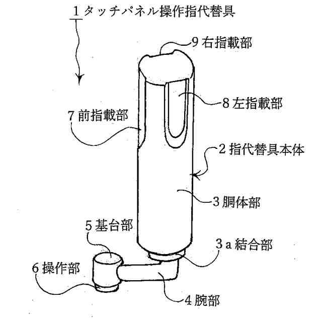 【解決手段】タッチパネル操作指代替具1は、小さな印鑑のような円柱の胴体部3を備えた指代替具本体2を備え、胴体部3は、下方側底面部位に結合部3aを設け、結合部3aの底面中央部位付近に前方側へ突き出る水平姿勢で丸棒状の腕部4を設け、腕部4は、先端部位に小さな円柱を短く輪切りしたような形状の基台部5を設け、基台部5は、下方側底面部位に手指腹と同一の働きをするアルミニウム材で操作部6を一体状で設けたことを特徴とする。