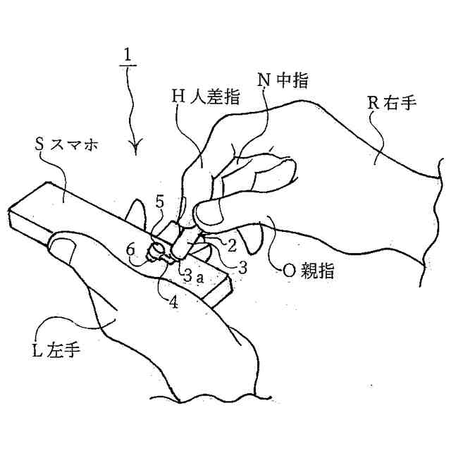 本発明を使用する時は、右手(L)の場合は前指載部(7)に人差指(H)・左指載部(8)に親指(O)・右指載部(9)に中指(N)を当接させて印鑑を摘まみ持つ要領で持ち、スマホ(S)の画面に操作部(6)を接触させて、従来のように指腹で操作するのと同じ要領と感覚で動作を行う。図3と図4と図6参照。