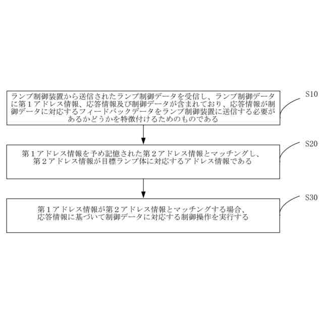 【解決手段】ランプ制御装置から送信されたランプ制御データを受信し、ランプ制御データに第1アドレス情報、応答情報及び制御データが含まれており、応答情報が制御データに対応するフィードバックデータをランプ制御装置に送信する必要があるかどうかを特徴付けるためのものであることと、第1アドレス情報を予め記憶された第2アドレス情報とマッチングし、第2アドレス情報が目標ランプ体に対応するアドレス情報であることと、第1アドレス情報が第2アドレス情報とマッチングする場合、応答情報に基づいて制御データに対応する制御操作を実行することと、を含む。