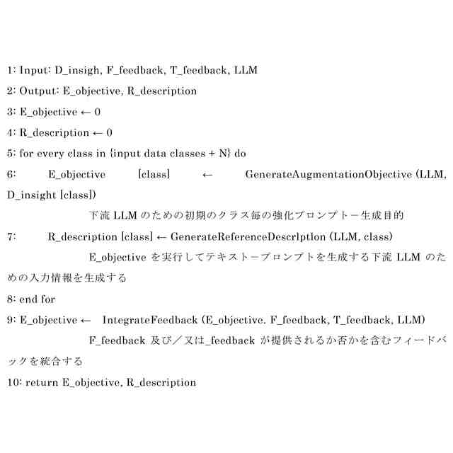 【解決手段】 画像の元のトレーニングセット内の画像の画像説明を生成し、少なくとも1つのLLMを用い元のトレーニングセット内で十分に表現されていない少なくとも1つのドメイン及び/又はクラスを決定し、該決定に基づき第2LLMを用い少なくとも1つのテキストプロンプトを生成するための第3LLMに対する少なくとも1つの命令を生成し、第3LLMを用い少なくとも1つの命令に基づきテキスト-画像モデルのための少なくとも1つのテキストプロンプトを生成し、テキスト-画像モデルを用い少なくとも1つのテキストプロンプトに基づき少なくとも1つの合成画像を生成し、画像処理MLモデルのトレーニングに使用する画像の強化トレーニングセットを生成し、画像の強化トレーニングセットは、画像の元のトレーニングセットと少なくとも1つの合成画像を含む。