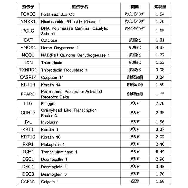 (4)さらに、FOXO3、NMRK1、POLG、HMOX1、NQO1、TXN、TXNRD1、CASP14、KRT14、PPARD、GRHL3、KRT1、KRT10、PKP1、TGM1、DSC1、DSG1、DSG3及びCAPN1からなる群より選択される、少なくとも1種の遺伝子の発現を亢進させる、(1)~(3)のいずれか1つに記載の皮膚機能改善剤。