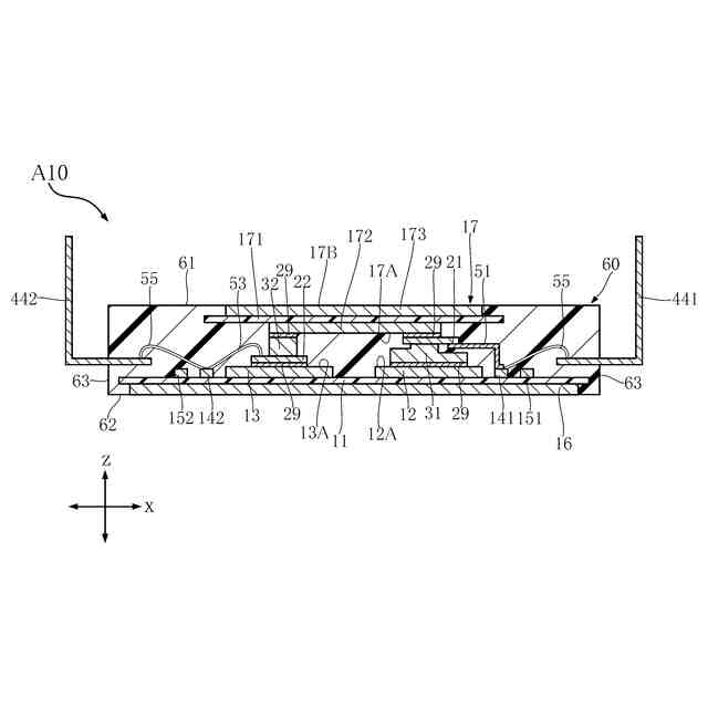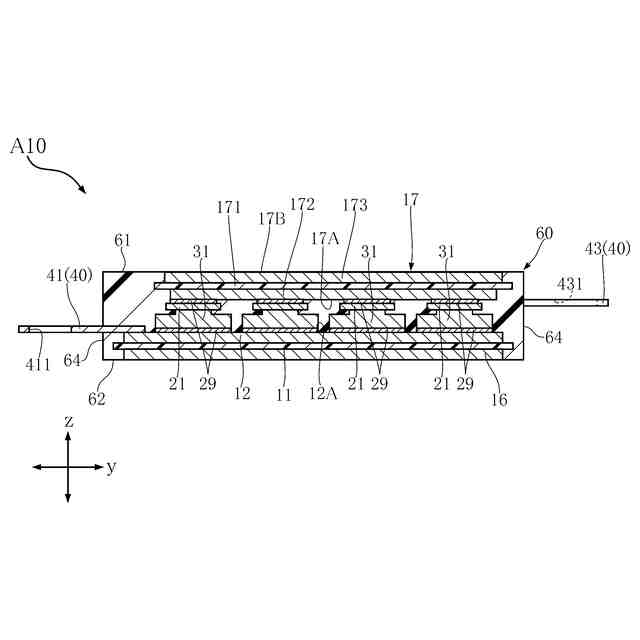 【解決手段】 半導体装置A10は、第1絶縁層11と、第1絶縁層11に接合された第1導電層12、第2導電層13および第1放熱層16と、第1半導体素子21および第2半導体素子22と、導通部材17と、封止樹脂60とを備える。第1放熱層16は、第1絶縁層11を基準として第1導電層12および第2導電層13とは反対側に位置する。第1半導体素子21は、第1導電層12に導電接合された第1電極と、導通部材17が導電接合される第2電極とを有する。第2半導体素子22は、導通部材17が導電接合される第3電極と、第2導電層13に導電接合される第4電極とを有する。前記第2電極の極性と、前記第3電極の極性とは、互いに異なっている。第1放熱層16および導通部材17は、封止樹脂60から露出している。
