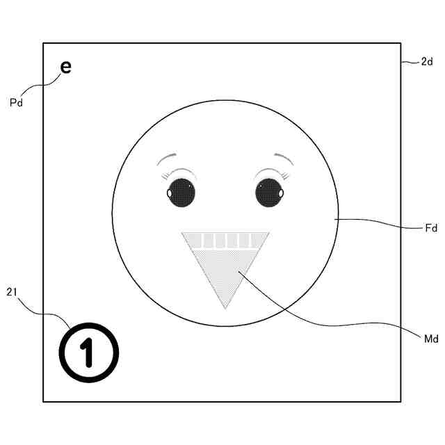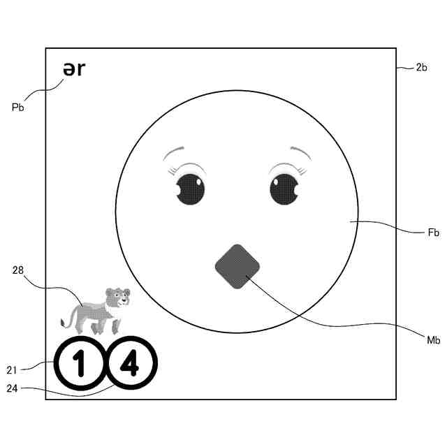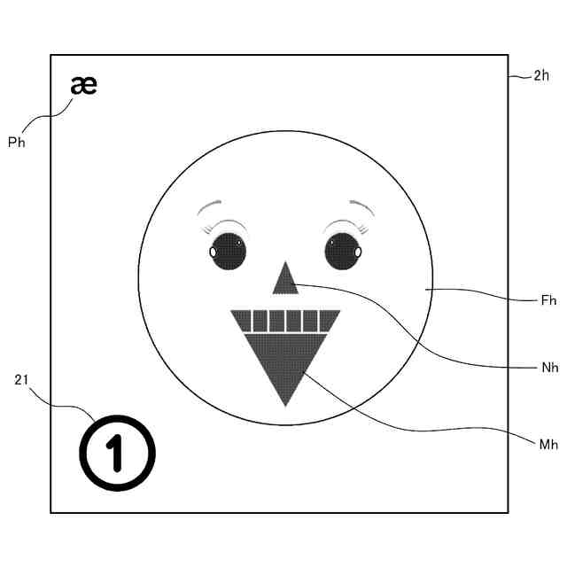 人の顔を模し、対応する母音を発音する際の口の形を図形化した口型図形を含む顔表示と、複数の前記識別子それぞれと同様の態様である複数の識別表示のうちの1つ又は2つと、を有し、