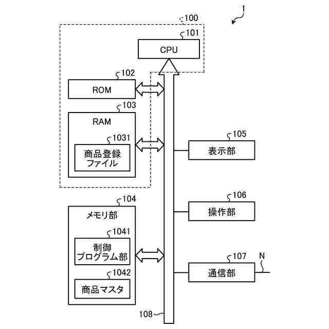 CPU101は、POS端末1の各部を統括的に制御する。ROM102は、各種プログラムを記憶する。RAM103は、プログラムや各種データを展開するワークスペースである。例えば、RAM103は、商品登録ファイル1031を備える。