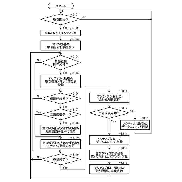しかしながら従来の技術では、取引を保留した場合に、保留した取引の売上登録された商品を示す画面と、次の取引で売上登録された商品を示す画面とが隣接して表示されるため、各取引の状態が分かりづらいという問題があった。