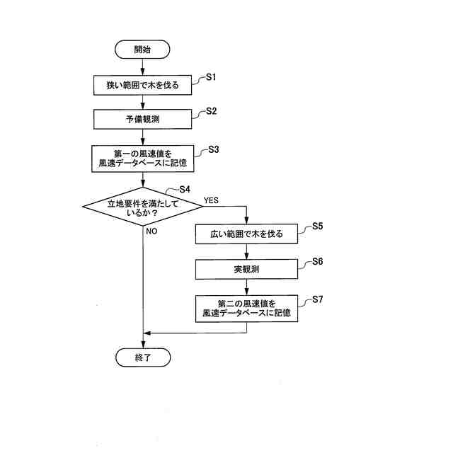 従来の観測方法では、最初から実観測を行うこととなってしまい、風力発電設備の設置場所の周辺を広い範囲で風速計測の障害となる立木を伐採することになる。立木の伐採には、人が作業するコスト、伐採した立木を設置場所から運搬するコスト等がかかる。風速計測を行った結果、観測地点が風力発電設備の立地要件を満たしていないと判定した場合は、必要以上の面積で立木を伐採したことによる、伐採に要したコストが無駄になる。また、観測地点の周辺環境にも影響を与えることとなる。