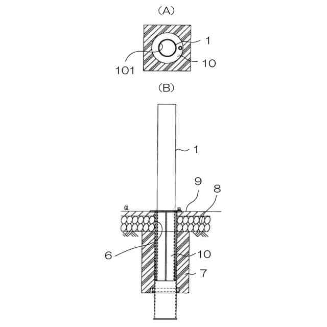 さや管を有し、前記さや管は管状であって少なくとも下部が地中に設けられ上部に挿入口を有し、前記芯材は下端が前記挿入口に着脱可能に挿入されていることを、特徴とする請求項1,2,3または4記載のボラード。