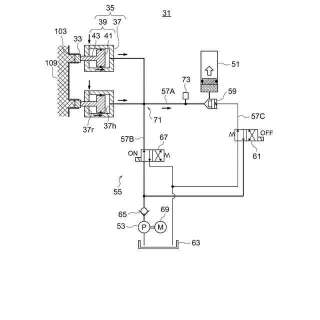 前記液圧源から前記ヘッド側室へ延びており、前記ヘッド側室の側の一部が前記ACC流路と共用されている液圧源流路と、