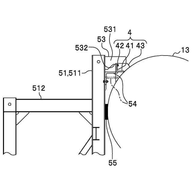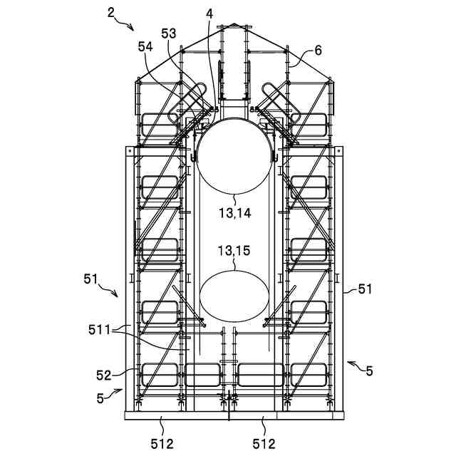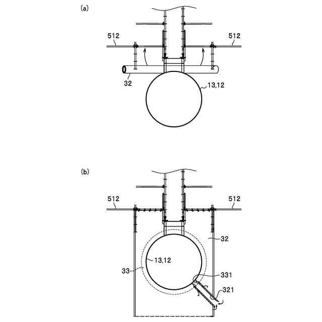 そのため、構造物自体に足場を設置して、高所での作業スペースを確保する場合がある。例えば、特許文献2には、構造物の頂部に受け止め金具を介して脱着可能に組まれた屋根型の屋根フレームと、屋根フレームの上面を覆う覆工材と、構造物の外周に配置された作業用足場と、屋根フレームから垂下られた側面養生シートとを備える足場装置が開示されている。