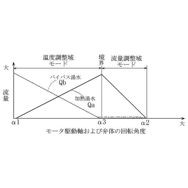 【解決手段】温水装置WHの弁装置Aは、制御モードとして、弁動作用のモータ駆動軸8の回転角度が、所定の第1の角度α1から第2の角度α2の間で変化する過程において、熱交換器11からの加熱湯水とバイパス湯水との混合流量比を変更して外部への出湯温度を調整可能な温度調整域モードと、バイパス湯水の流量を所定の最小流量以下に維持しつつ前記加熱湯水の流量が変更されるように前記弁装置に流れる湯水の総流量を調整可能な流量調整域モードと、の流量制御を順次実行可能であり、熱交換器11の出口側温度Toutが所定の基準温度Taよりも高温である第1の条件が成立しているときには、温度調整域モードおよび温度調整域モードと流量調整域モードの境界から流量調整域モードへの変更が禁止される。