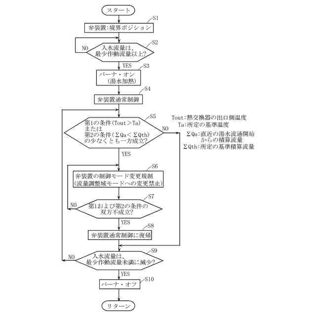すなわち、熱交換器の出口側温度が所定の基準温度よりも高温である第1の条件が成立し、熱交換器から高温の湯水が現に流出し、または流出する虞があるときには、弁装置の制御モードは流量調整域モードには変更されない。したがって、熱交換器から高温の湯水が流出しているにも拘わらず、弁装置が流量調整域モードにあることに起因して前記湯水の温度を低下させることが困難になることは回避される。弁装置の温度調整域モードにおいて、前記高温の湯水の温度を確実に低下させ、外部への不当な高温出湯を適切に防止することが可能である。