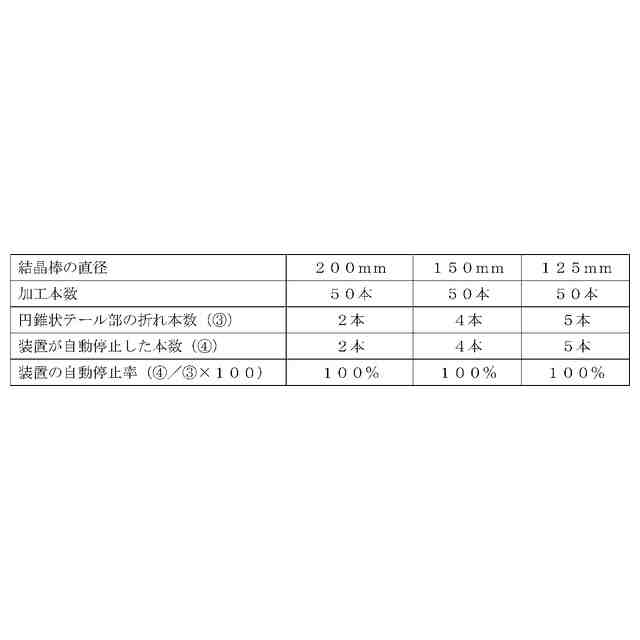 近年の半導体デバイスはその性能向上と製造コストの低減のため、半導体デバイス製造に使用されるウェーハの大直径化が進んでいる。この半導体デバイス製造に使用されているウェーハは、チョクラルスキー法等により円筒状の直胴部の軸方向の端部に円錐状のコーン部とテール部を有する結晶棒を作製し、円筒研削機にて結晶棒の外周を円筒研削後、軸方向に対して垂直にスライスして板状に切り出し、研磨工程を経て製造されている。近年、1本の結晶棒から得るウェーハの枚数の増加やウェーハの大直径化に伴い、作製される結晶棒も長尺化・大直径化し、高重量化している。