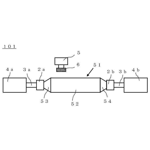 支持装置2a、2bは、図2に示すように、円錐孔を有する支持部(第1支持部)11、垂直に切断された平坦面53b、54bを支持する支持部(第2支持部)12を含む。