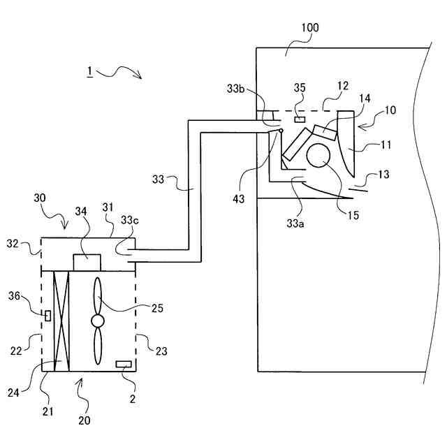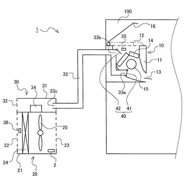 室内機10は、筐体11、室内熱交換器14及び室内ファン15を備えている。筐体11は、例えば略直方体形状をしている。筐体11の例えば上面部には、吸込口12が形成されている。また、筐体11の例えば側面部の1つには、吹出口13が形成されている。室内熱交換器14及び室内ファン15は、筐体11に収納されている。具体的には、室内熱交換器14は、吸込口12と吹出口13との間に設けられている。また、室内ファン15は、吸込口12と吹出口13との間に設けられており、筐体11内の空気の流れ方向において室内熱交換器14の下流側となる位置に配置されている。室内機10は、室100の例えば壁に設けられている。室内ファン15が駆動することにより、吸込口12から筐体11内に室100の空気が吸い込まれる。そして、筐体11内に吸い込まれた空気は、室内熱交換器14を通って、吹出口13から筐体11の外部に吹き出される。すなわち、筐体11内に吸い込まれた空気は、室内熱交換器14を通って、室100の内部に吹き出される。