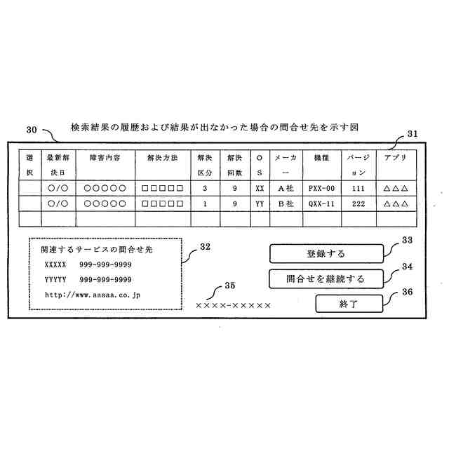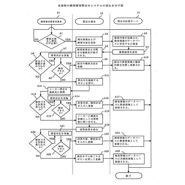 【解決手段】携帯端末障害時に問合せ端末から携帯端末の情報と障害内容をもとに問合せ応答サーバのデータベース内の障害情報を検索し、問合せ端末の画面に過去の解決回数の多い順に回答履歴が表示され、該当する回答履歴が無い場合は関連するメーカー問合せ連絡先が表示される機能を具備する障害に関する問合せを支援するシステムであり、障害が解決された回答履歴は、新規内容はデータベースに追加され、既にデータベースに登録されている内容は解決回数として加算される携帯端末障害問合せシステムである。