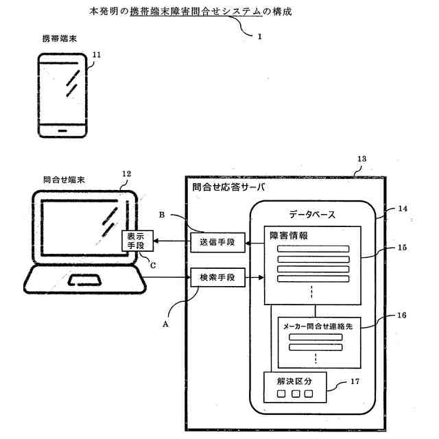 図1は本発明の携帯端末障害問合せシステム1の構成を示す。携帯端末11に障害が発生した際の障害内容を問い合わせるシステムであって、前記携帯端末の端末情報と障害内容を送信する問合せ端末12と、種々の障害情報とこの障害情報に対応する解決策が蓄積されたデータベース14と、前記端末からの障害内容の送信を受けて前記データベース内の障害情報15を検索する検索手段Aと、該検索手段によって検索された前記携帯端末の障害情報に対応する解決策を回答として送信する送信手段Bと、該受信手段によって送信された解決策が表示される前記端末の表示手段Cを備えている。