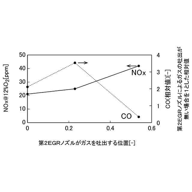 本開示の第1実施形態による第2EGRノズルが存在する燃焼設備1におけるNOxの濃度分布の一例を示す図である。
