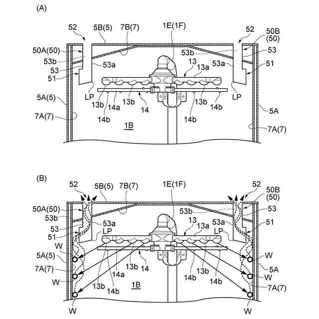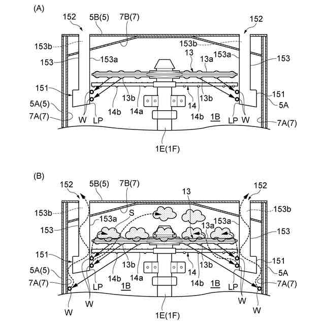 (3)上記(1)又は(2)の洗浄機では、洗浄室に被洗浄物を出し入れ可能な開口部を開閉するドア部を備え、開口部の開口面に直交する方向を奥行方向、奥行方向と鉛直方向との両方に直交する方向を幅方向としたとき、ダクトは、洗浄室の幅方向における両端に配置される一対の第一ダクト及び第二ダクトであり、第一ダクト及び第二ダクトの第一開口部、流路及び第二開口部は、奥行方向に延在していてもよい。この構成では、洗浄室において発生した水蒸気が第一開口部に進入しやすくなると共に、第一開口部から第二開口部に向かって空気の流れを形成しやすくなる。