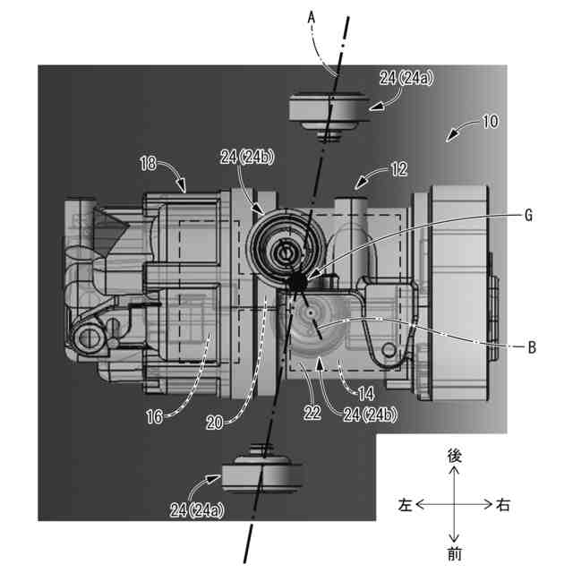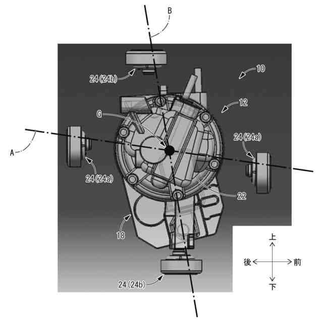 該電動モータの該出力軸方向と交差するトルクピッチ軸の延伸方向で該ケースの両側に該第一の防振装置がそれぞれ配されていると共に、該電動モータの該出力軸方向及び該トルクピッチ軸と交差するトルクヨー軸の延伸方向で該ケースの両側に該第二の防振装置がそれぞれ配されており、