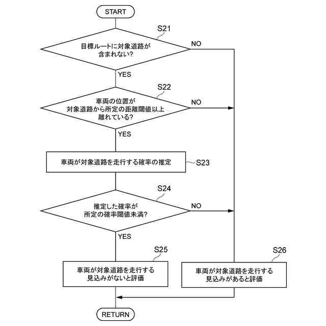 一実施形態において、報知制御部は、目標ルートに対象道路が含まれない場合、又は、車両の位置が対象道路から所定の距離閾値以上離れている場合、車両が対象道路を走行する見込みがないと評価してもよい。この場合、目標ルートに対象道路が含まれるか否か、又は、車両の位置が対象道路から所定の距離閾値以上離れているか否かに応じて、車両が対象道路を走行する見込みを評価することができる。