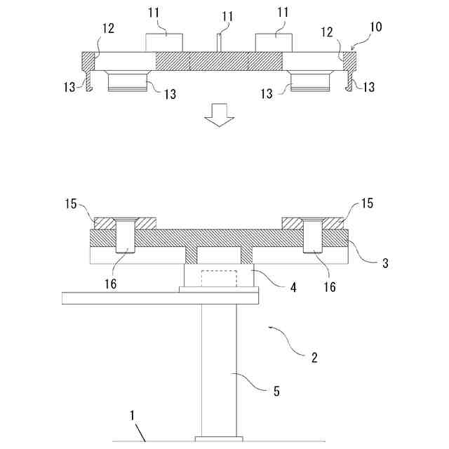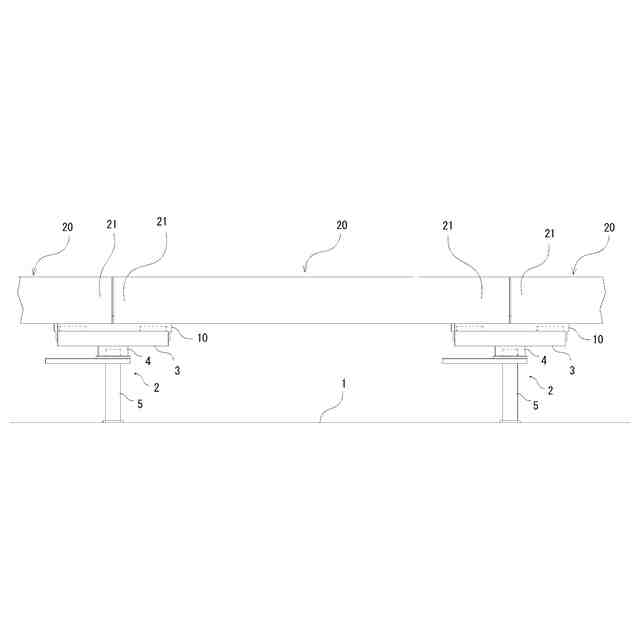 図4に示すように、基礎面1上に立設された支持脚2は、上部支持板3と、上部支持板3に固定された高さ調整部材4と、前記高さ調整部材4が上下方向に調整可能に取り付けられた基礎部5とから成る。