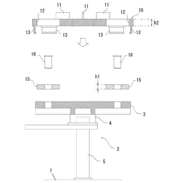 ここで、図4~図8から明らかなように、磁石15の厚みh1は、板状パネル受け部10の厚みh2より薄くされており、それにより、板状パネル受け部10の貫通孔12に磁石15が挿入されるように板状パネル受け部10を上部支持板11に固定すると、板状パネル受け部10の貫通孔2の上部空間が、底面に磁石15が設けられた円筒状の凹部14を形成する。