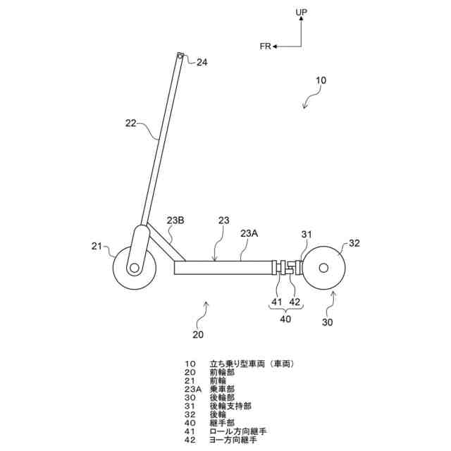 請求項1に記載の立ち乗り型車両は、操舵輪として構成された1つの前輪と、乗員が乗車する乗車部と、を有する前輪部と、2つの後輪と、前記2つの後輪を回転可能に支持する後輪支持部と、を有する後輪部と、前記乗車部と前記後輪支持部とを連結する継手部と、を備え、前記継手部は、車両略前後方向に沿う軸周りの回転自由度を有するロール方向継手と、車両略上下方向に沿う軸周りの回転自由度を有するヨー方向継手と、を車両前側から車両後側に向けてこの順に有する。