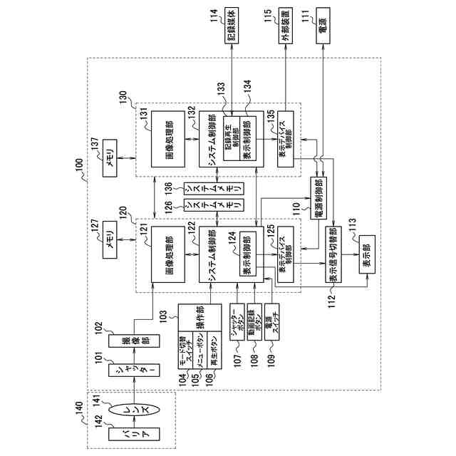 図1は、本実施形態による撮像装置の一例としてのデジタルカメラ100の構成例を示すブロック図である。図1において、レンズユニット140は、デジタルカメラ100に対して装脱が可能であり、撮影レンズ141を有する。撮影レンズ141は、通常、複数枚のレンズから構成されるが、ここでは簡略して1枚のレンズのみで示している。バリア142は、デジタルカメラ100の撮影レンズ141を含む撮像系を覆うことにより、撮影レンズ141、シャッター101、及び撮像部102を含む撮像系の汚れや破損を防止する。