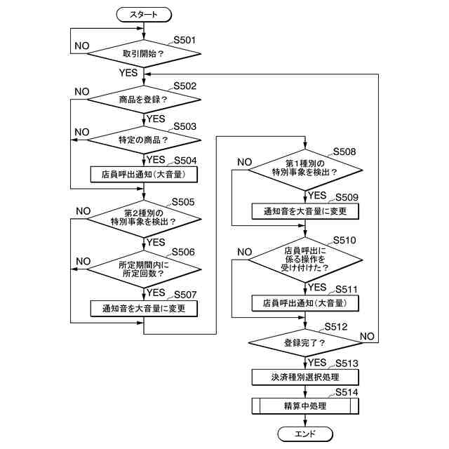 前記異なる事象として前記商品登録手段により登録された商品が特定の商品であるか否かを判定する判定手段を備え、