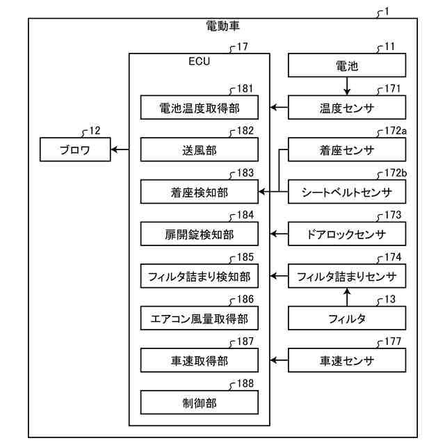 ハイブリッド車(HV:Hybrid Vehicle)や電気自動車(EV:Electric Vehicle)などの電動車は、電池を冷却するブロワを備えている。ブロワは、車室内の空気を電池に送風することで当該電池を空冷する。ブロワは、ブロワカバーに設けられるフィルタよって埃等から保護される。