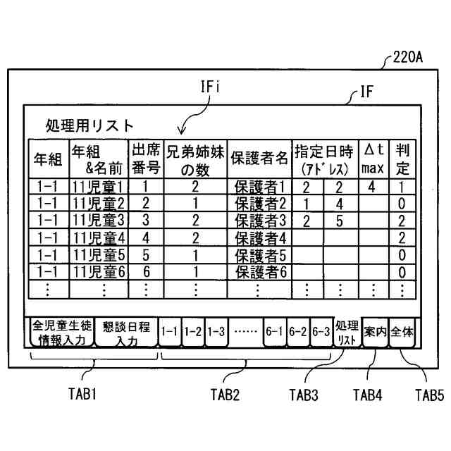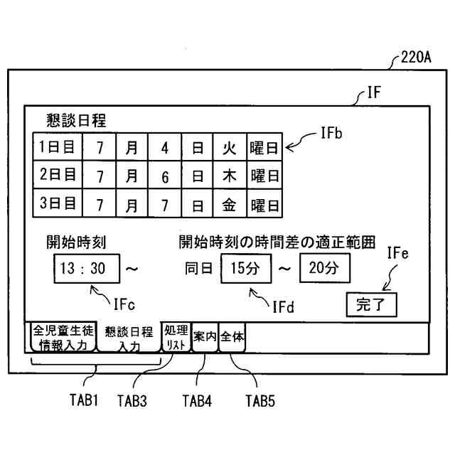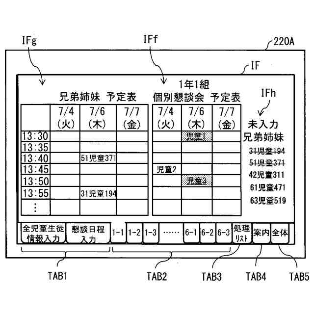 ここで、第1の個別懇談会予定表は、日時の表となっており、その表の中に自クラスの児童生徒の名前が入力部を介して入力されたときに、入力された児童生徒(調整対象児童生徒)の予定を、入力された箇所に対応する日時(指定日時)で受け付けるインターフェースとなっている。第2の個別懇談会予定表は、日時の表となっており、その表の中に、自クラスの児童生徒の兄弟姉妹のうち、他クラスの第1の個別懇談会予定表で予定を受け付けた兄弟姉妹(入力済み兄弟姉妹)の名前をコンピュータの1つの画面に表示するインターフェースとなっている。