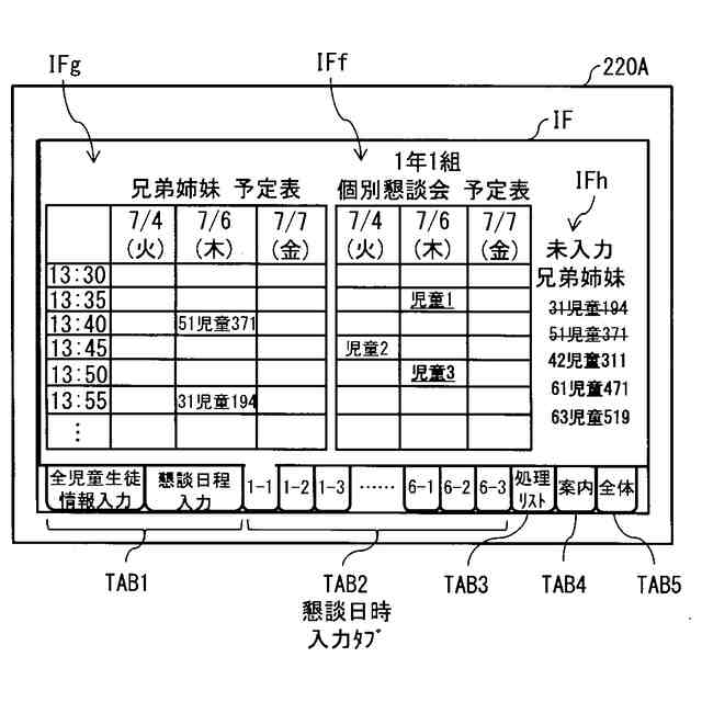 前記第2の個別懇談会予定表は、日時の表となっており、その表の中に、自クラスの児童生徒の兄弟姉妹のうち、他クラスの前記第1の個別懇談会予定表で予定を受け付けた兄弟姉妹(入力済み兄弟姉妹)の名前を前記画面に表示するインターフェースとなっており、