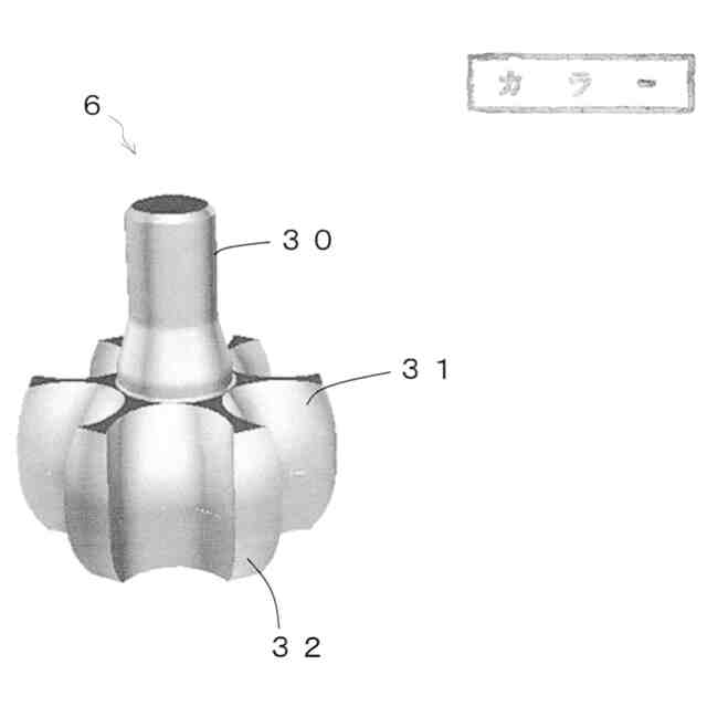 一方、固定式等速自在継手104は、外側継手部材112、内側継手部材113、ボール114および保持器115とからなる。外側継手部材112の球面状内周面118には軸方向に曲線状に湾曲した8本のトラック溝116が形成されている。内側継手部材113の球面状外周面119には、外側継手部材112のトラック溝116に対向するトラック溝117が形成され、両トラック溝116、117間にボール114が配置されている。
