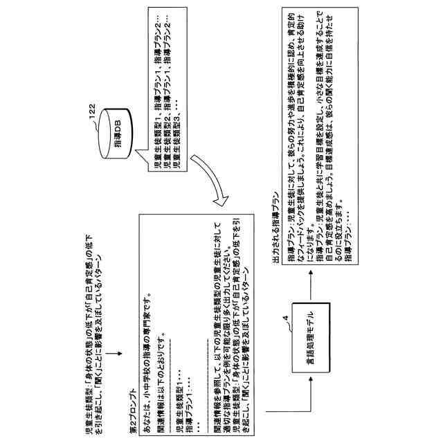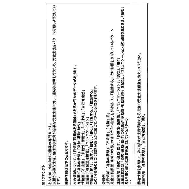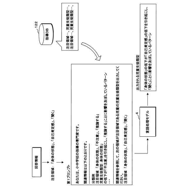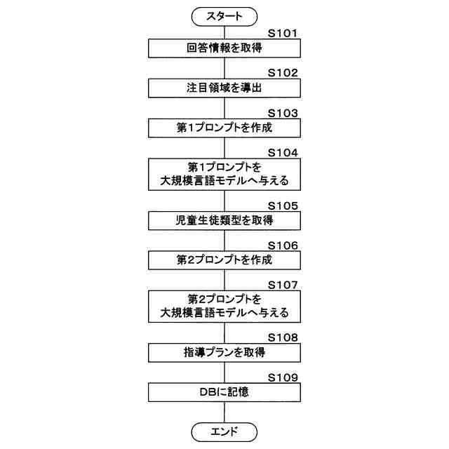 (5)上記(1)から(4)のいずれか1つに記載の指導情報の生成方法において、前記回答情報に応じた児童生徒類型又は注目領域を取得し、取得した前記児童生徒類型又は注目領域、及び予め定められた児童生徒類型又は注目領域と指導情報との対応情報を含むプロンプトを作成し、作成した前記プロンプトを前記言語モデルに与えることにより、前記指導情報を生成してもよい。