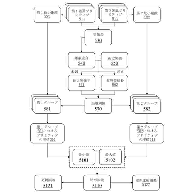 いくつかの実施例において、前記少なくとも1つの第1グループに基づいて前記更新領域を生成し、前記少なくとも1つの第2グループに基づいて更新比較領域を生成するステップは、前記少なくとも1つの第1グループにおけるプリミティブの座標の各座標軸での最小値及び最大値を取得し、前記最小値及び前記最大値からなる矩形領域に基づいて前記更新領域を確定するステップと、前記少なくとも1つの第2グループにおけるプリミティブの座標の各座標軸での最小値及び最大値を取得し、前記最小値及び前記最大値からなる矩形領域に基づいて前記更新比較領域を確定するステップと、を含む。