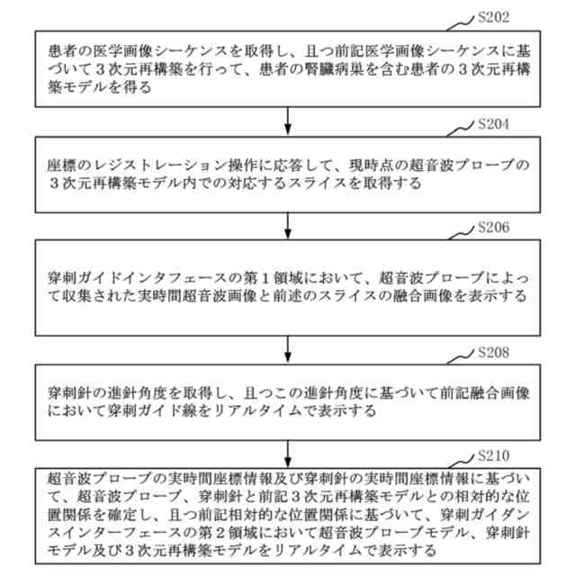 【解決手段】穿刺ガイダンスインターフェースの第1領域に、2次元超音波画像における穿刺針と腎臓との相対的な位置関係、及び医学画像スライスにおける穿刺針と腎臓との相対的な位置関係を表示することに加えて、超音波プローブ、穿刺針と3次元再構築モデルとの相対的な位置関係を利用して、穿刺ガイダンスインターフェースの第2領域において超音波プローブモデル、穿刺針モデル、及び3次元再構築モデルをリアルタイムで表示する。これにより、医師は2次元の視点から穿刺過程を確認するだけでなく、3次元の視点から穿刺過程における超音波プローブ、穿刺針と人体との相対的な位置関係を確認することができる。これにより、穿刺過程におけるガイダンス情報が豊富になり、穿刺の効率と精度が向上する。
